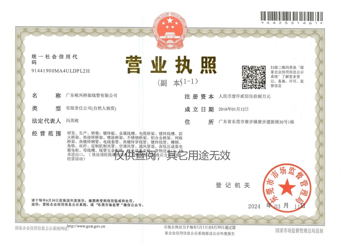廣東峻興橋架線管有限公司成立于2016年,注冊資金1258萬,公司面積約8000平方米,專業生產銷售:電纜橋架、金屬線槽、熱鍍鋅線管及相關配件全系列產品,是一家研發、生產、銷售、服務為一體化的綜合性大型生產制造廠家。公司注重產品質量、服務、品牌建設、不斷提高生產技術,優化生產,完善公司管理和服務,質量保證、產能高效、全力以赴立足于行業中,是電纜橋架、鍍鋅線管行業當中發展極快的企業單位之一。公司響應節能環保...